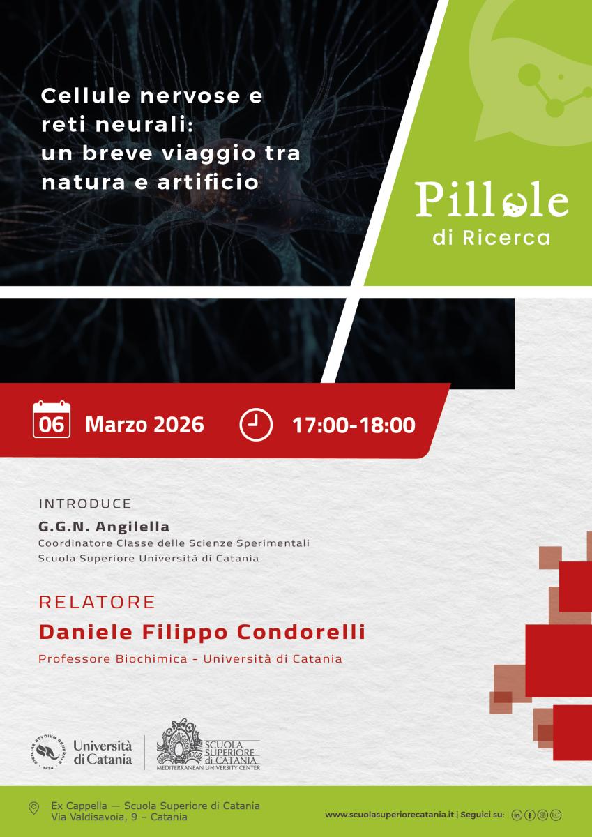 nell’ambito dello Stage di preparazione alle Olimpiadi di Neuroscienze, organizzato annualmente dalla Scuola Superiore dell’Università di Catania in collaborazione con l’Associazione Allievi SCC, le Pillole di ricerca di seguito citate in programma per il 6 marzo 2026, saranno aperte alla partecipazione anche degli studenti dell’Università di Catania afferenti ai Vostri Dipartimenti: