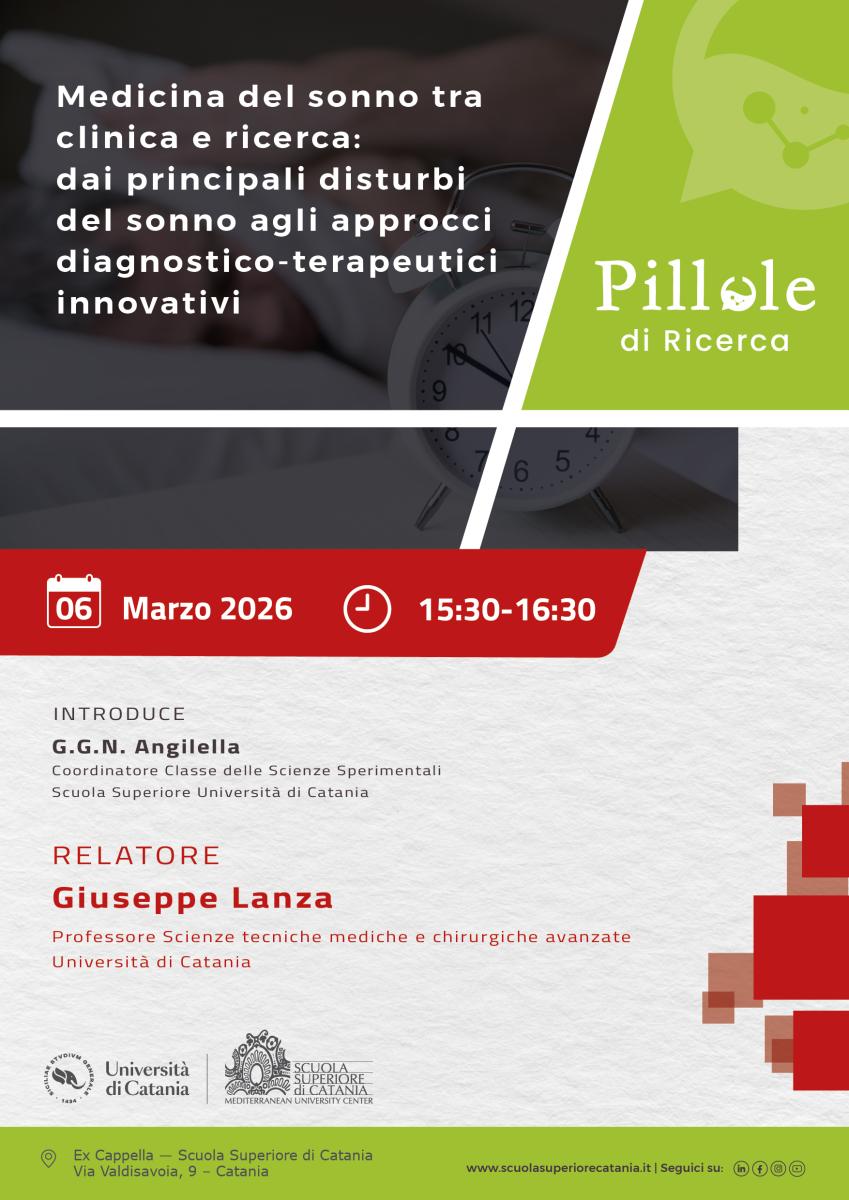 Medicina del sonno tra clinica e ricerca – Dai principali disturbi del sonno agli approcci diagnostico-terapeutici innovativi Una panoramica sui principali disturbi del sonno, con approfondimenti sui meccanismi neurofisiologici e sugli approcci diagnostici e terapeutici più recenti, dal punto di vista clinico e di ricerca scientifica. https://ssc.unict.it/medicina-del-sonno-tra-clinica-e-ricerca-dai-principali-disturbi-del-sonno-agli-approcci-diagnostico-terapeutici-innovativi/ |