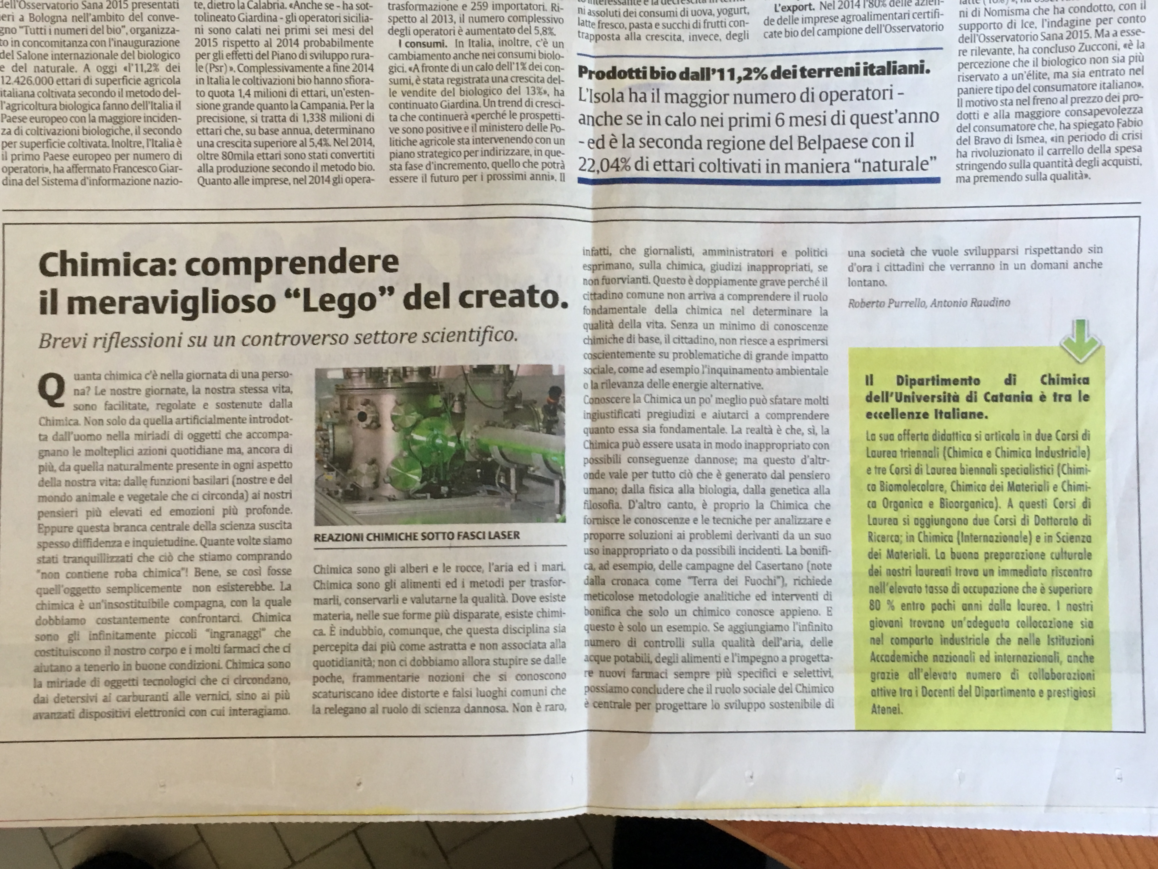 Articolo su La Sicilia 13/09/2015 'Chimica:comprendere il meraviglioso "Lego" del creato.' Articolo su La Sicilia 13/09/2015 'Chimica:comprendere il meraviglioso "Lego" del creato. Data: Domenica, 13 Settembre, 2015 - 09:00 Condividi Facebook Twitter Whatsapp Telegram Email