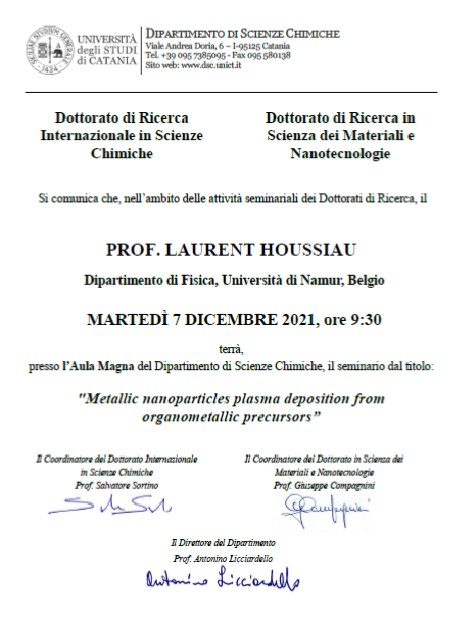 Martedì 7 Dicembre alle 09.30 in aula A il professor Laurent Houssiau, Universitè de Namur, terrà un seminario dal titolo "Metallic nanoparticles plasma deposition from organometallic precursors".